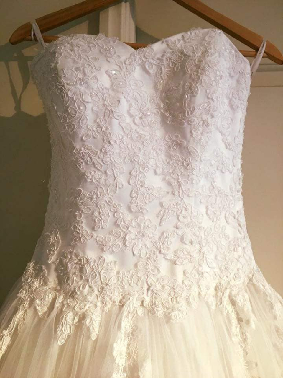 Vestido corte princesa, tono Ivory, un uso, talla 38 con corset por lo que podría servir para otras tallas cercanas. La parte superior tiene mostacillas con encaje, el diseño del encaje se continúa sutilmente con la falda, que está hecha de capas de tul (no requiere uso de falso). Mido 1.63 cm y lo usé con un taco pequeño de 4 cm.