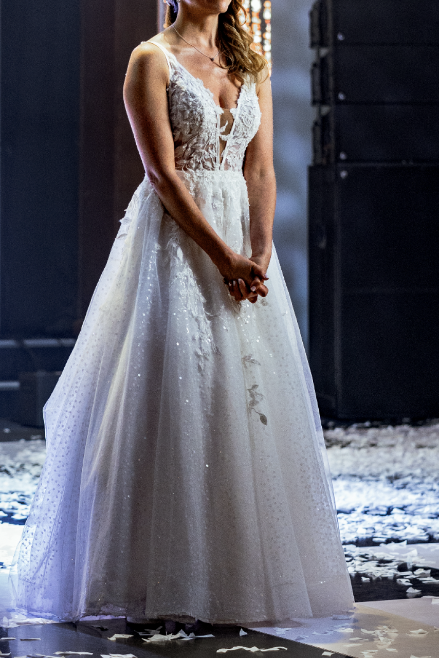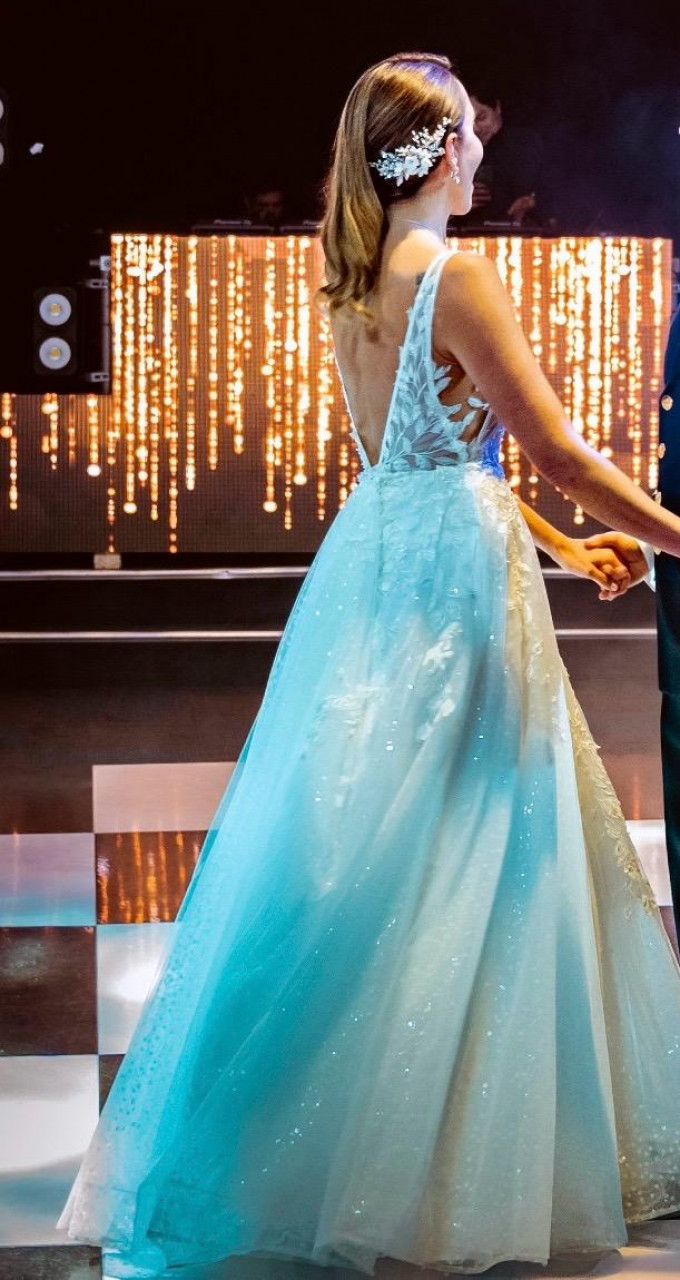 Talla: xs Estatura: 1,64cm Tela: tul, organza, crepe y satin Faldon posee detalles 3D y brillo Busto: 34B Solo 1 uso