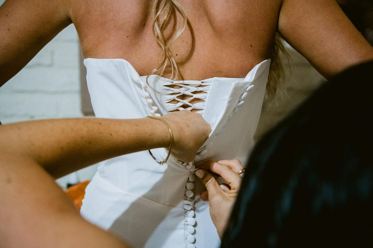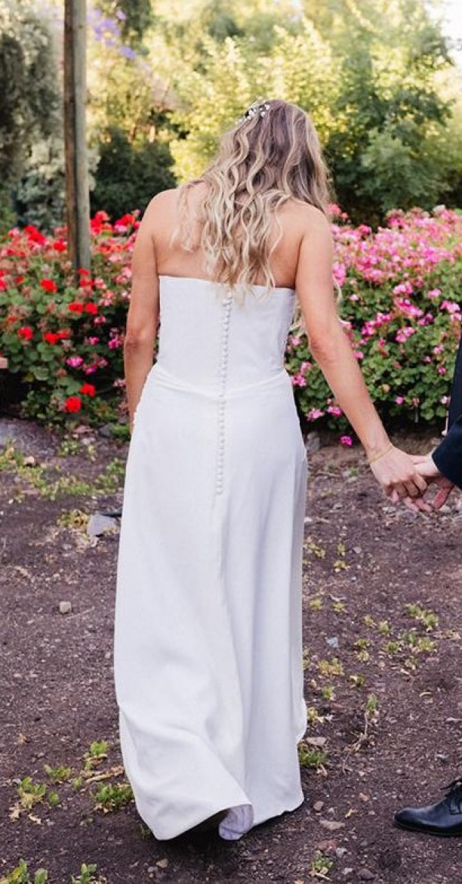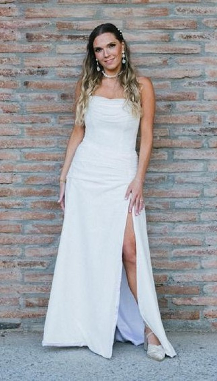 Vestido de novia strapples de corset, con apertura en la pierna, hecho a medida por Francisca Chicioada
