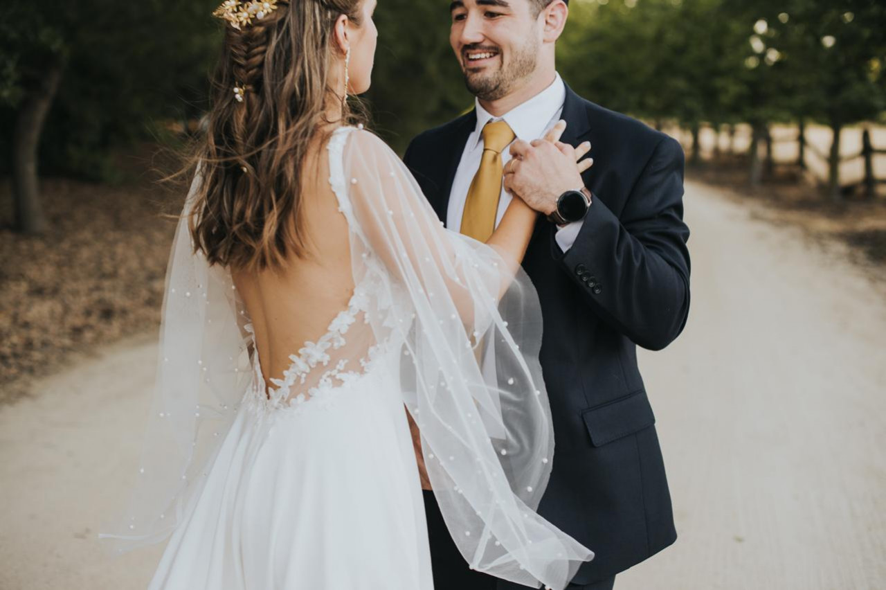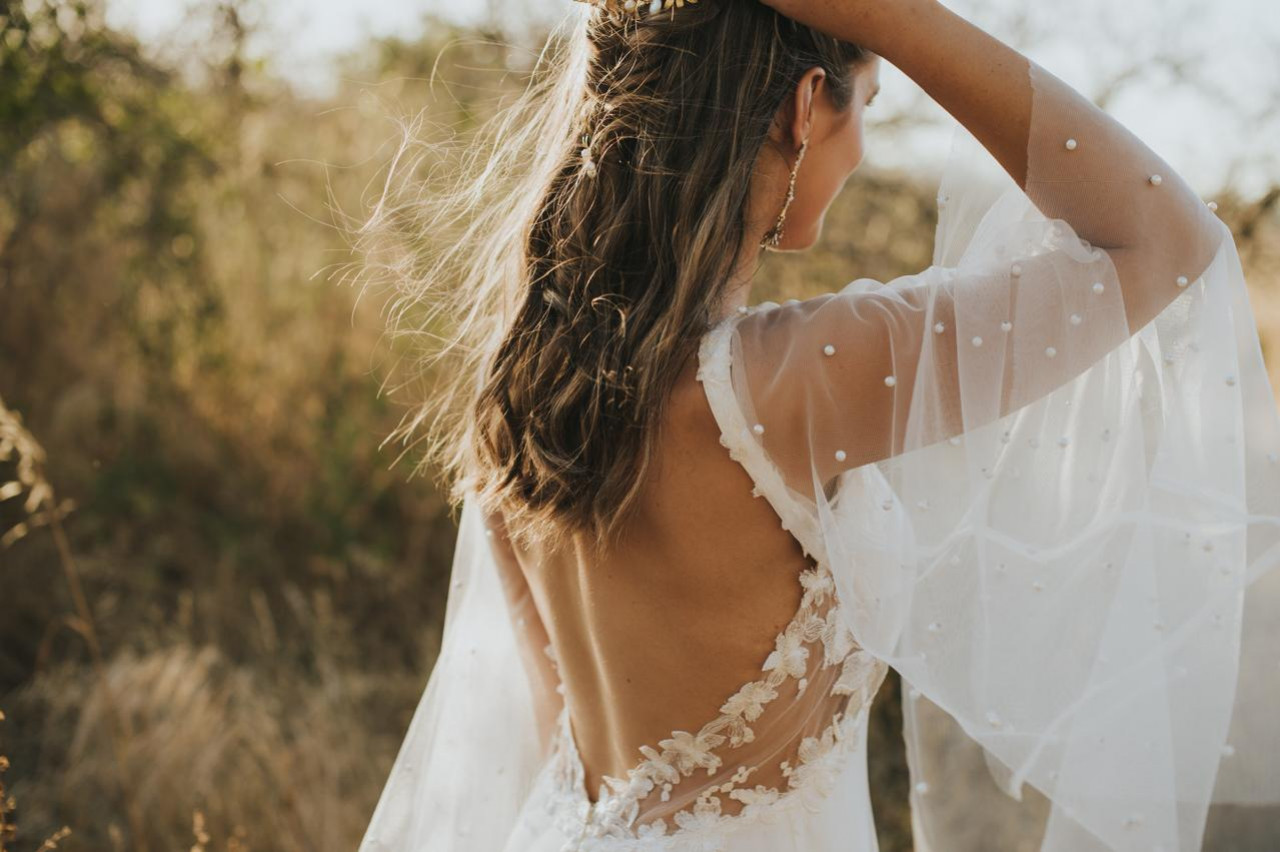 Tiene escote en V y mangas de tul con perlas, que además son desmontables, lo que permite usarlo de dos maneras durante el matrimonio.