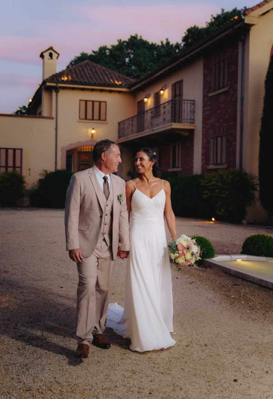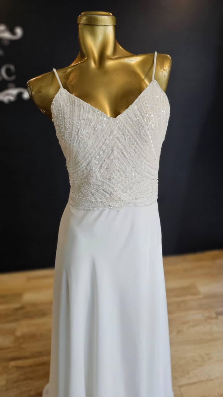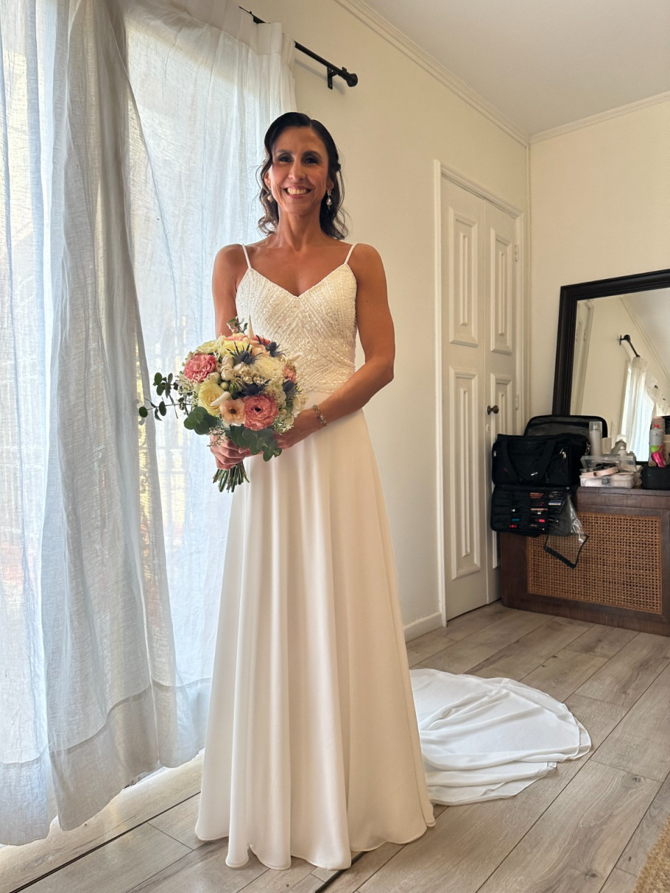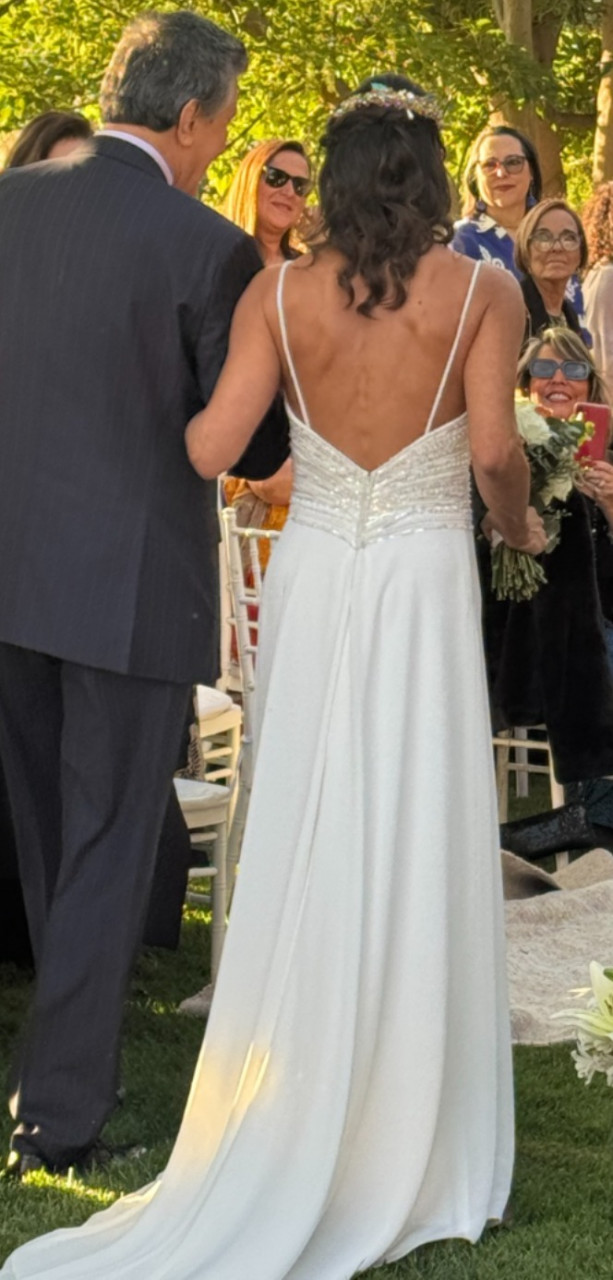 Hermoso vestido de novia con preciosa pedrería, delicado escote y muy cómodo de llevar. Faldón de de gasa chifón con cola que se puede acortar para una mayor comodidad en el baile. De la diseñadora Isabel Cisterna de Cautiva Novias.