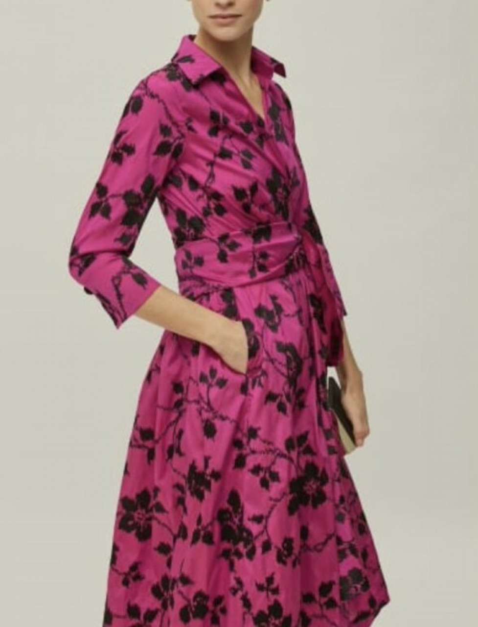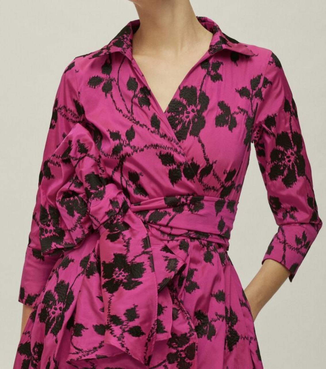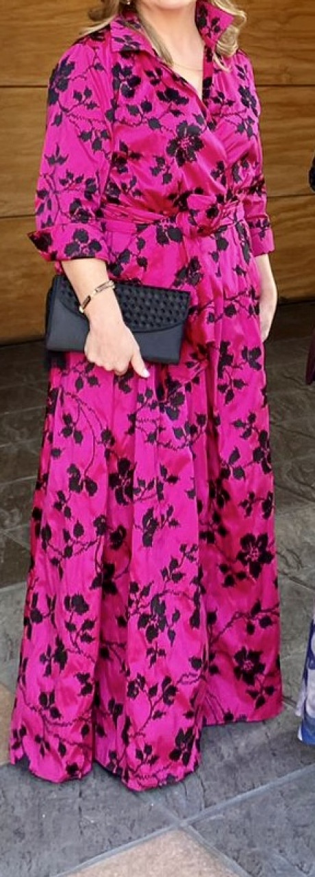 Vestido largo, tafetán fucsia bordado floral negro colección 2020 Carolina Herrera. Estilo cache-coeur ( cruzado), bolsillo lateral , cinturón misma tela ,manga 3/4. Talla 12 Solo una postura y enviado a lavar en seco.