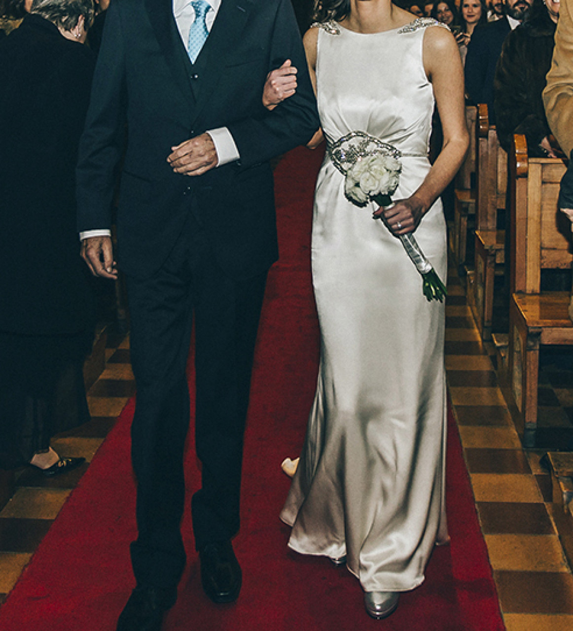 Vestido de seda con pedrería en hombros y cintura. Muy elegante y cómodo