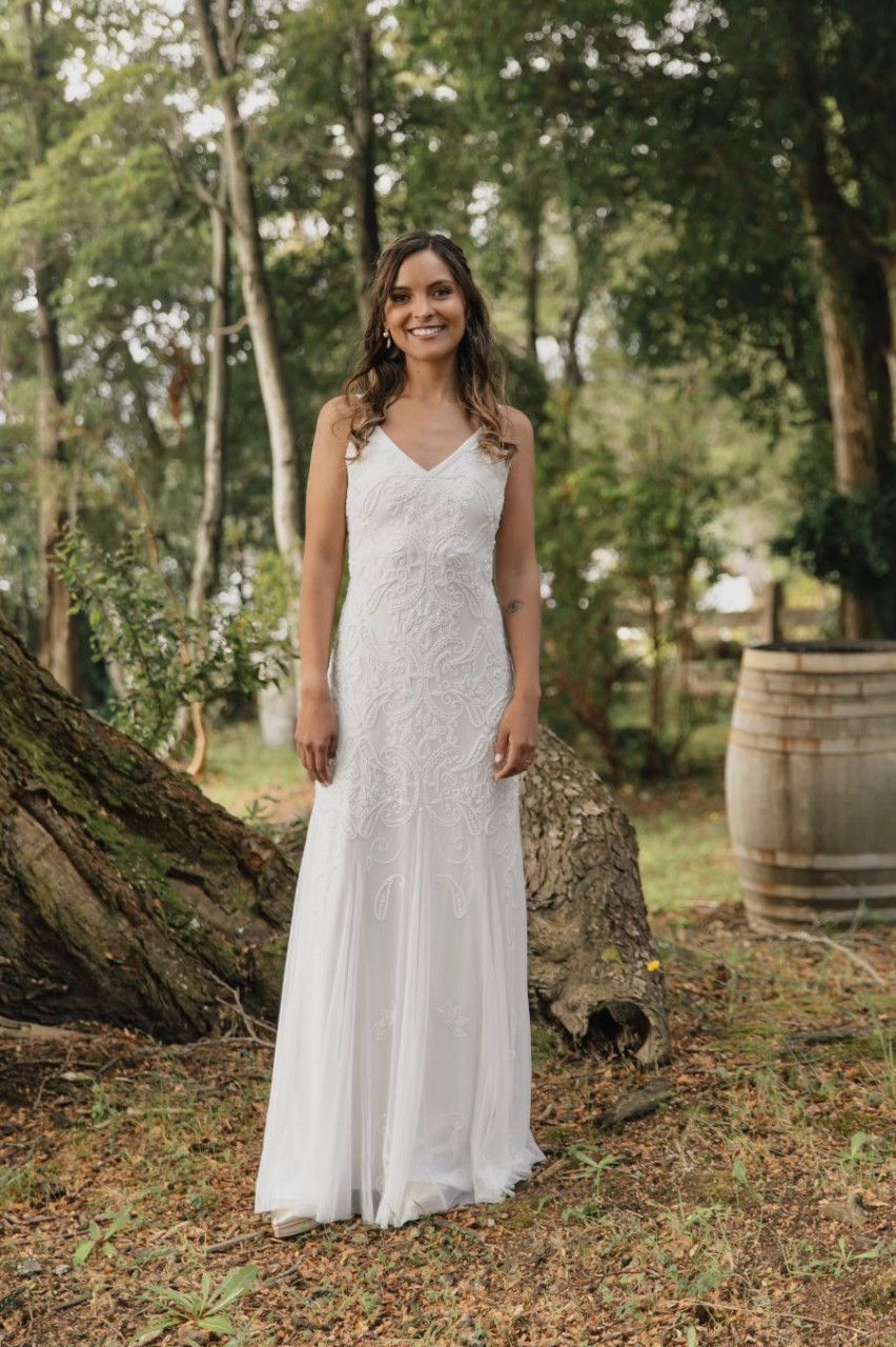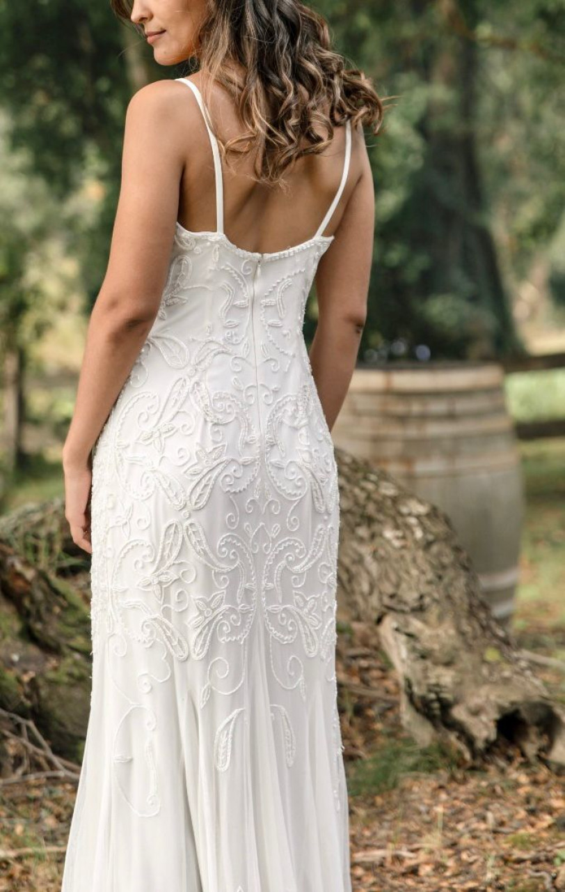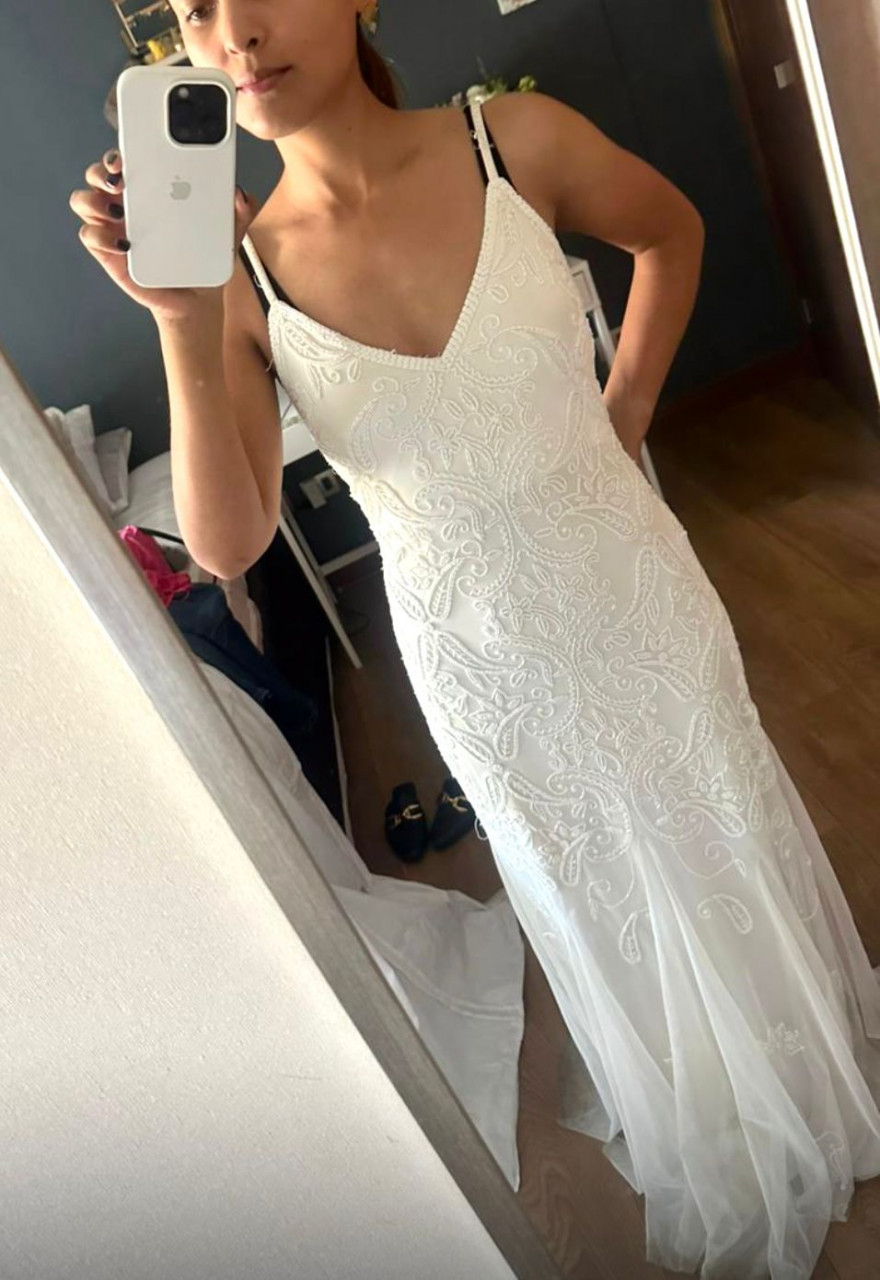 Precioso bordado tipo boho, la tela semi elasticada se ajusta al cuerpo, los tirantes se pueden volver a alargar (yo los cosí un poco), tiene un par de mostacillas sueltas pero está en buen estado. Yo mido 1,62 y usé tacos de entre 8 y 10cm aprox, soy talla s y 36 en pantalón pero es suelto abajo.