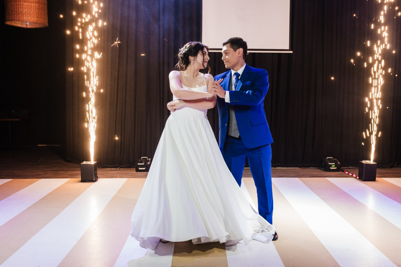 Cuenta con una falda con tres capas de falsos que le dan volumen y movimiento, además tiene una impresionante cola de 1 metro que aporta un toque verdaderamente soñado para tu entrada, tiene un broche para guardar y poder disfrutar sin molestias la fiesta.