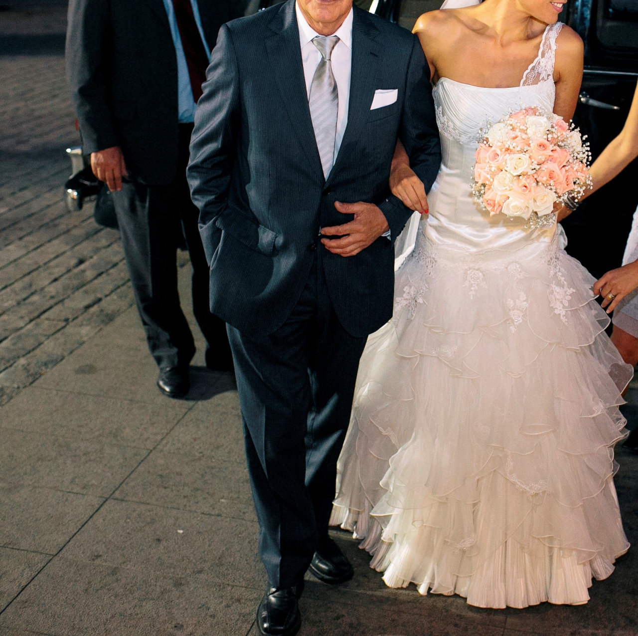 Vestido de alta costura diseñado y confeccionado por Macarena Rivera (Carretel) de encaje con charmeuse de seda en perfecto estado. Tiene una pequeña cola que después de ocuparla se engancha a la parte de atrás del vestido. Además tiene un falso que se pone y se saca. Vestido talla S, estatura 1.60. Vestido lavado.